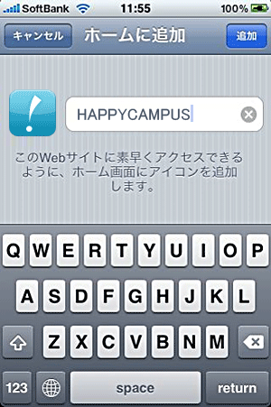 3. アイコンの名前「HAPPYCAMPUS」を入力し、「追加」ボタンをタップする。