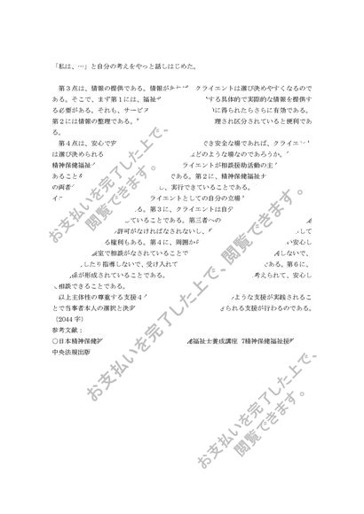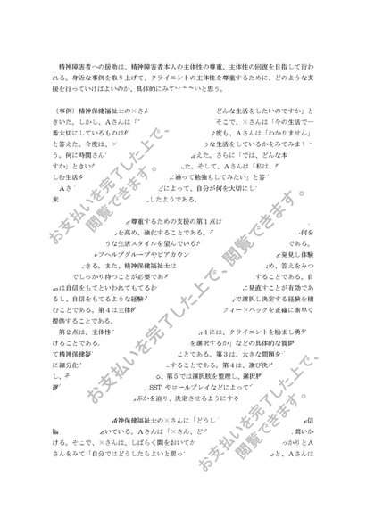 精神障害者への援助について、精神障害者本人の主体性の尊重するためにどのような支援を行っていけばよいのか。身近な事例を取り上げて具体的に説明しなさい。(A判定・2044文字)