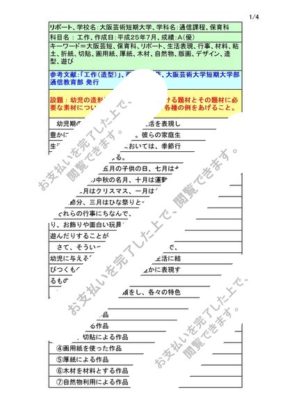 工作:大阪芸短リポート評価【A優】幼児の造形活動や造形表現における題材とその題材に必要な素材について説明せよ。なるべく各種の例をあげること、NJ06~14対応
