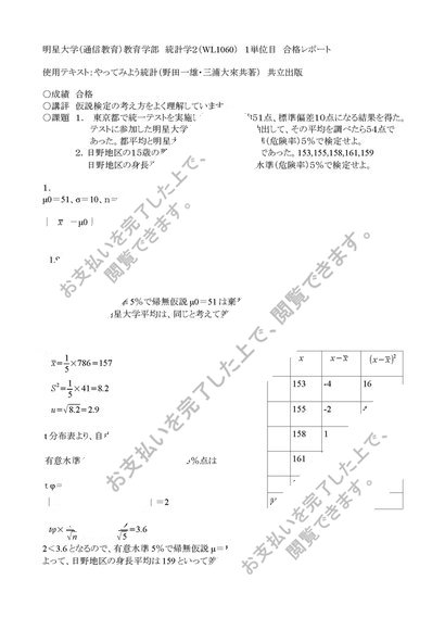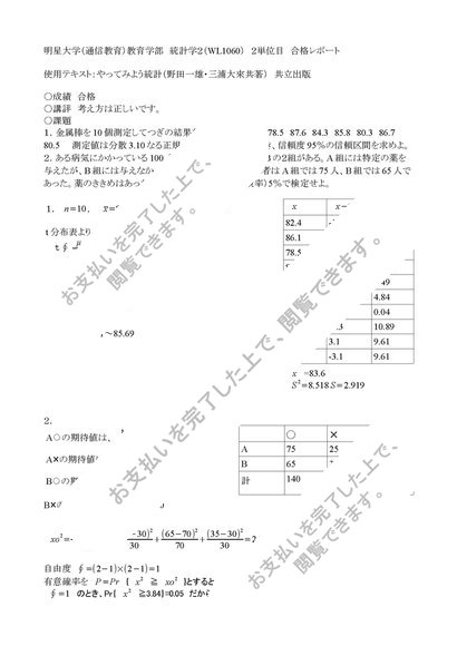 <2013~2016年課題>明星大学(通信教育)教育学部 統計学2(WL1060) 1~2単位目 合格レポート