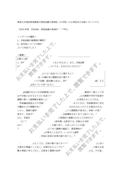 2015年度・2016年度・2017年度 PB3080 特別活動の指導法(小学校) 2単位目 合格レポート