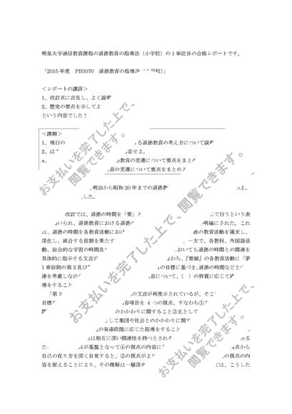 2015年度・2016年度・2017年度 PB3070 道徳教育の指導法(小学校) 1単位目 合格レポート