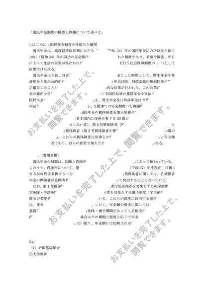 【社会保障論 A評価】国民年金制度の概要と課題について述べよ