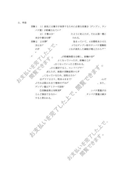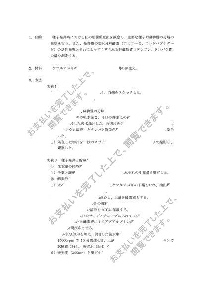 種子発芽時における胚の形態的変化を観察し、主要な種子貯蔵物質の分解の観察を行う。