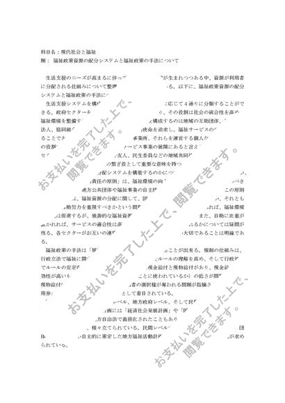 11. 科目名「現代社会と福祉」 題「福祉政策資源の配分システムと福祉政策の手法について」