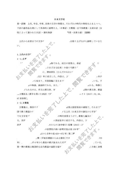 最新レポート日本文学史 第一設題 上代、中古、中世、近世の文学の特質を、それぞれの時代の特性をふまえつつ