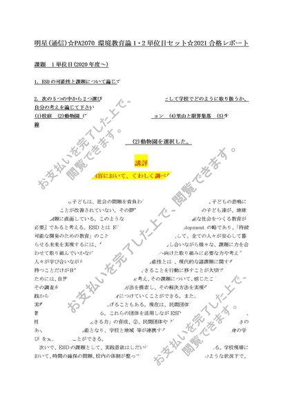 明星(通信)☆環境教育論 最新合格レポート(優判定) 2単分セット 講評付き☆