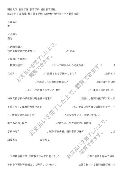 <明星大学通信>2021年 5月実施 科目終了試験 PA1080 特別なニーズ教育総論『優』
