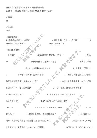 <明星大学通信>2021年 4月実施 科目終了試験 PA2240 教育方法学『優』