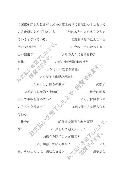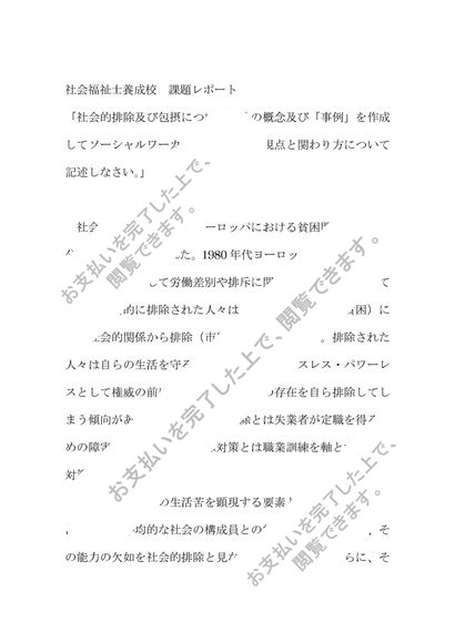 社会的排除及び包摂について、その概念及び「事例」を作成してソーシャルワーカーとして必要な視点と関わり方について