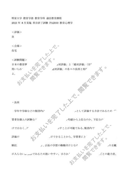 <明星大学通信>2021年 8月実施 科目終了試験 PA2030 教育心理学『良』