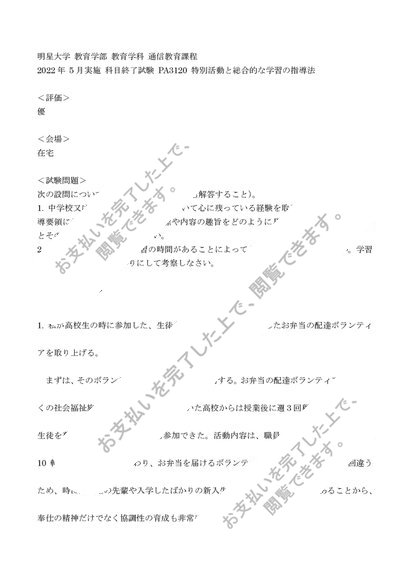 <明星大学通信>2022年 5月実施 科目終了試験 PA3120 特別活動と総合的な学習の指導法『優』