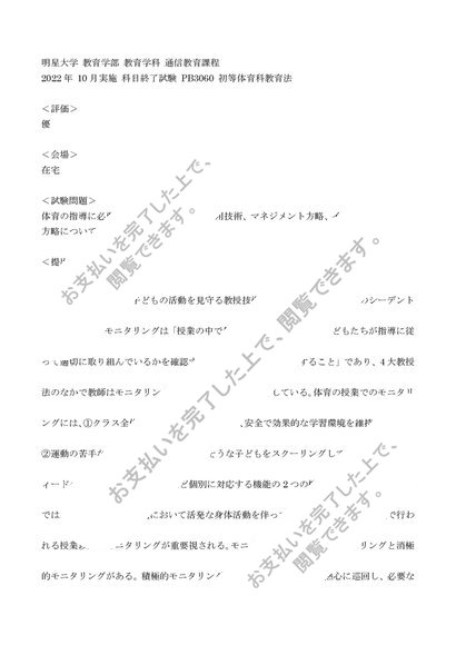<明星大学通信>2022年 10月実施 科目終了試験 PB3060 初等体育科教育法『優』