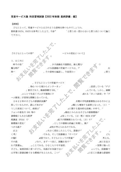 八洲学園大学 児童サービス論 科目習得試験【2022年秋期 最終評価:優】