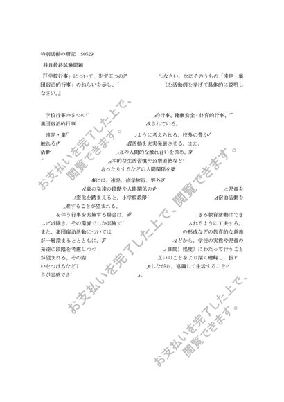 特別活動研究 S0529 科目最終試験問題 『「学校行事」について、先ず五つの活動内容を列挙しなさい。次にそのうちの「遠足・集団宿泊的行事」のねらいを示し、さらに実施上の留意点を活動例を挙げて具体的に説明しなさい。』