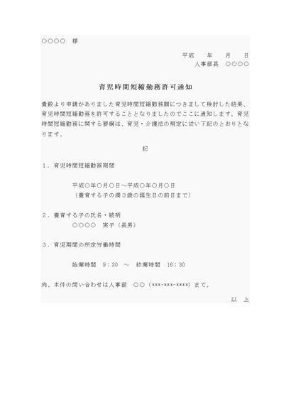 通知書(育児時間短縮勤務許可)