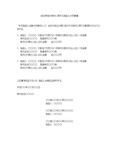 設立時発行株式に関する発起人の同意書