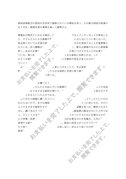 社会科概論科目最終試験:資料活用能力の育成が全学年で重視されている理由を述べ、その能力育成の授業のあり方を、地域学習の事例を通して説明せよ。
