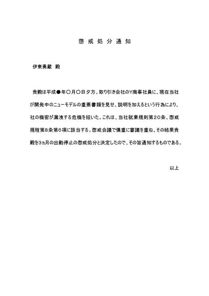 出勤停止の懲戒処分通知書