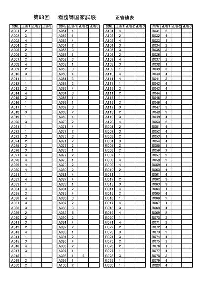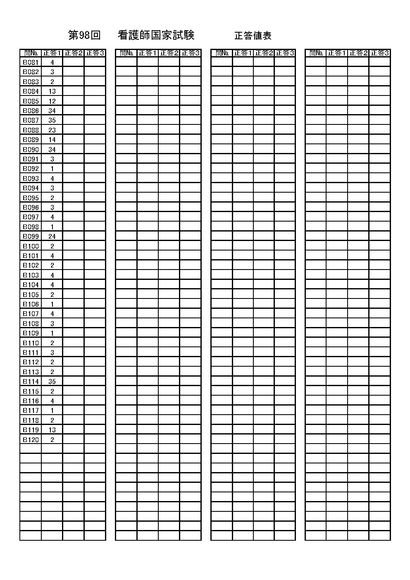 第98回看護師国家試験問題 正答