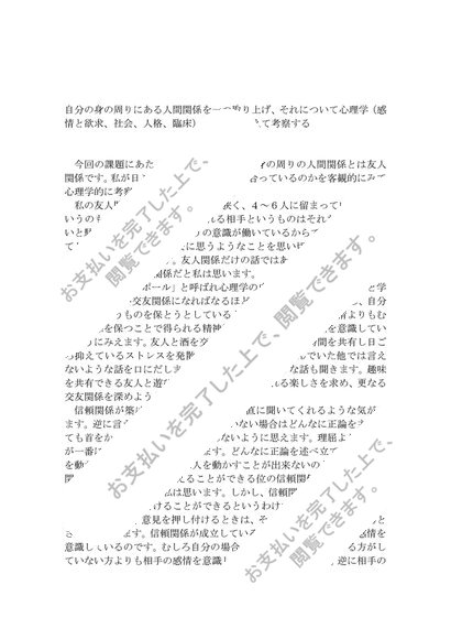 自分の身の周りにある人間関係を一つ取り上げ、それについて心理学(感情と欲求、社会、人格、臨床)の理論を交えて考察する