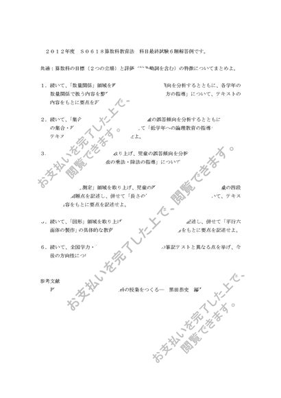 2012年度 算数科教育法 科目最終試験6題 合格済み