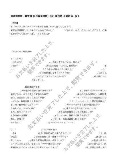 八洲学園大学 図書館制度・経営論 科目習得試験【2021年秋期 最終評価:優】