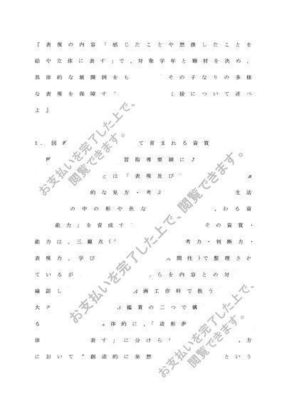 図画工作科指導法「表現の内容「感じたことや想像したことを絵や立体に表す」で、対象学年と題材を決め、具体的な展開例をもとに「その子なりの多様な表現を保障する」教師の支援について述べよ。