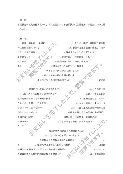 【優評価】貧困概念の拡大を踏まえつつ、現代社会における公的扶助(生活保護)の役割について述べなさい