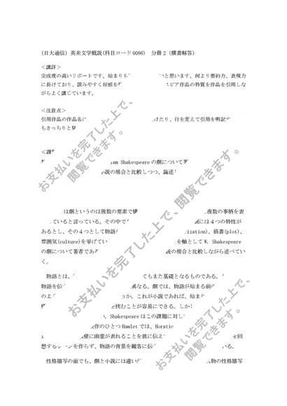 【日大通信】英米文学概説 分冊2(高評価合格リポート)