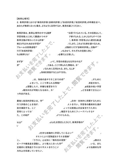 【教育心理学】教育評価における「事前的評価(診断的評価)」「形成的評価」「総括的評価」の特徴を述べ、あなたが教師になった場合、どのように活用するか、意見を論じてください。