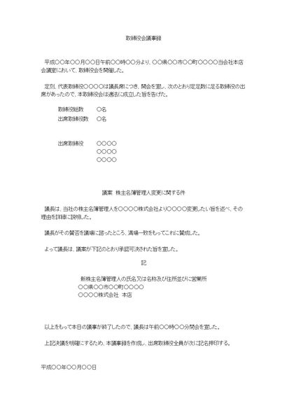 取締役会議事録(株主名簿管理人変更について)