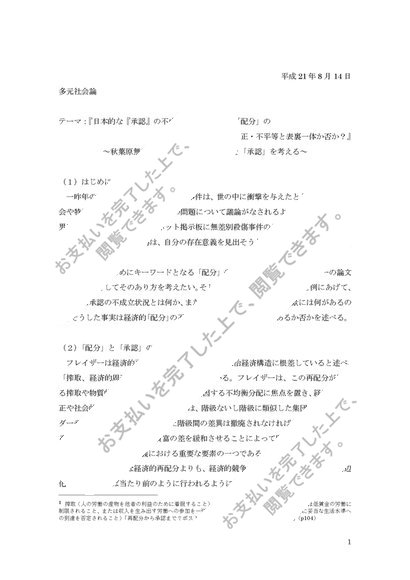 多元社会論 日本的な『承認』の不成立状況は、実は、「配分」の不公正・不平等と表裏一体か否か?
